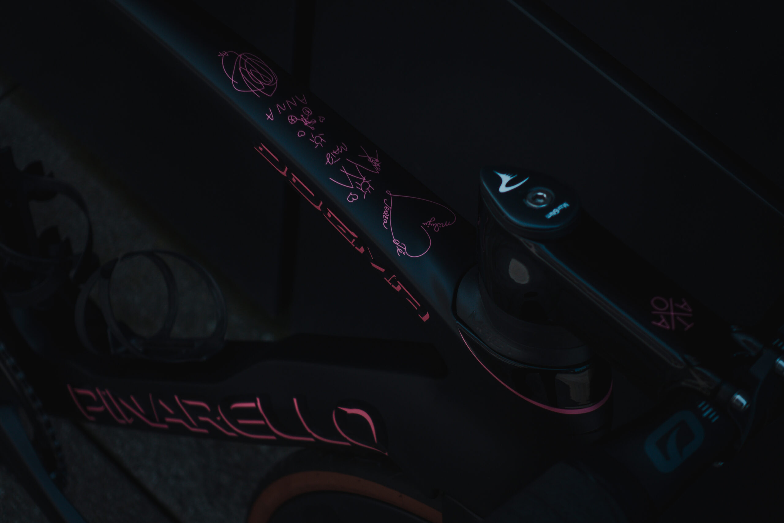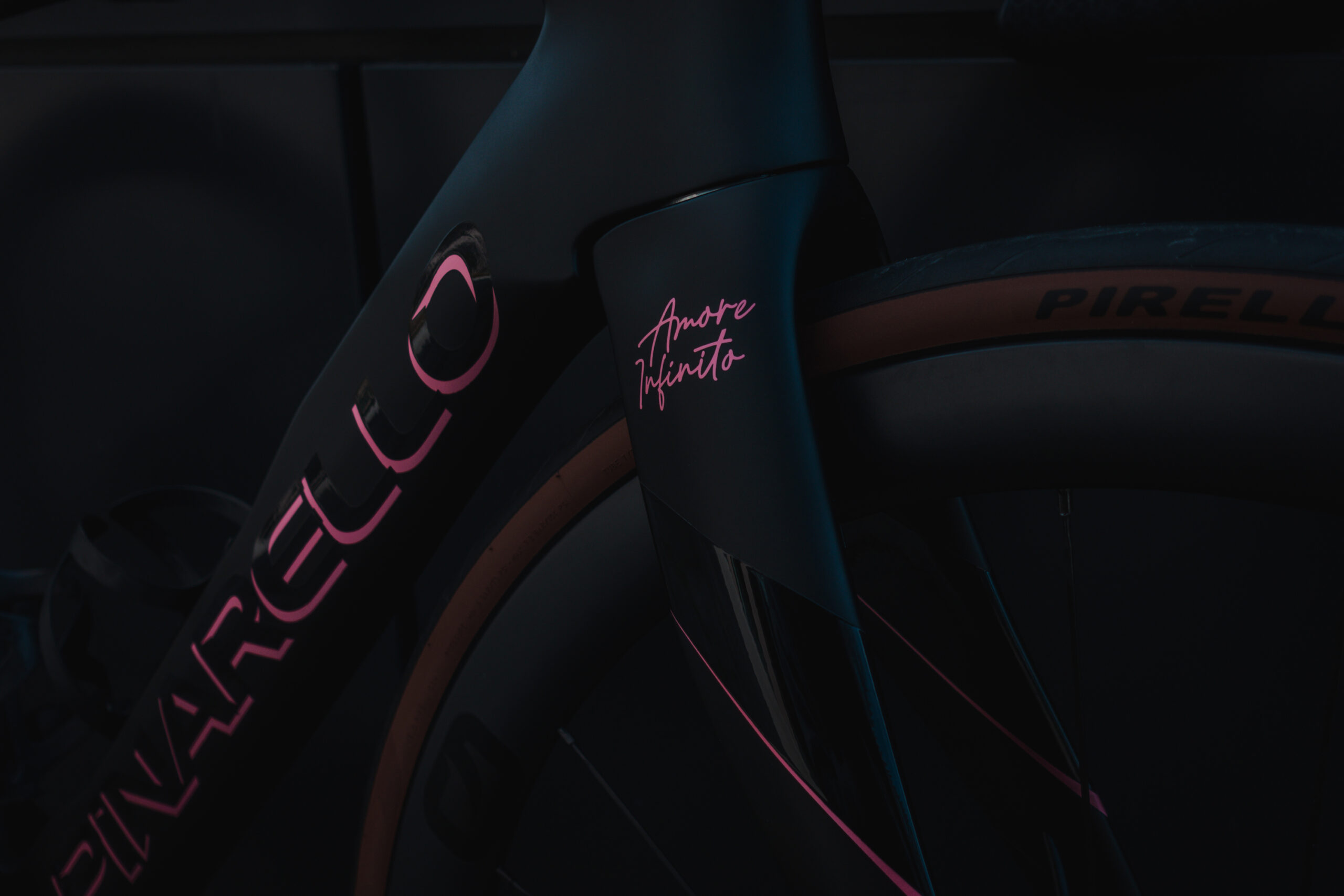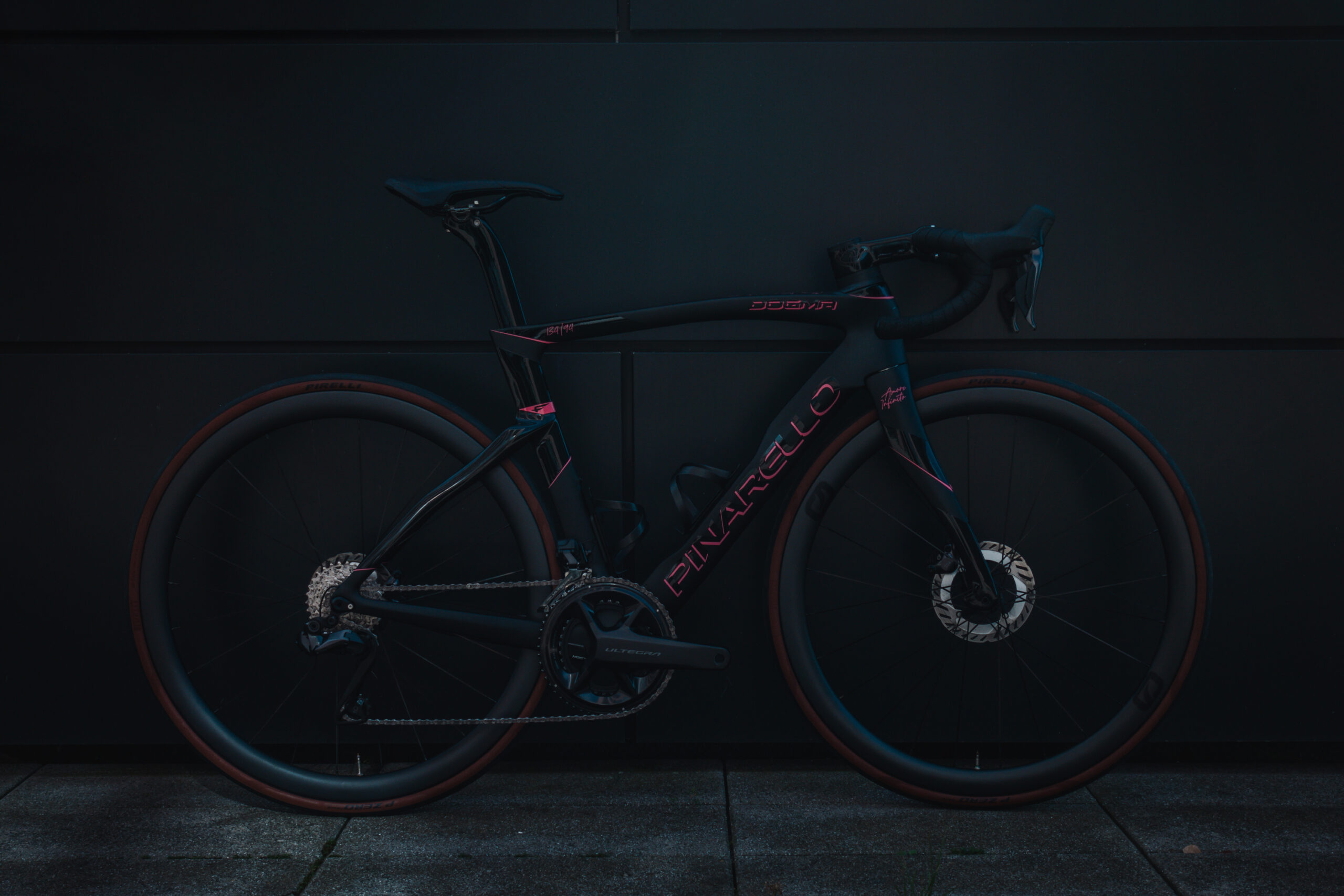 Jan wanted to incorporate the color pink into the design to pay homage to the Giro d’Italia, of which he is an avid fan. The bike’s original color scheme was B.O.B.—a blend of glossy black and matte black. From this, the concept of the “Shifted Design” was born. While the layout of the graphic elements remained unchanged, all the glossy segments were shifted a few millimeters, subtly revealing the pink background beneath — a symbolic unveiling of the true Italian racing essence of the Pinarello Dogma.